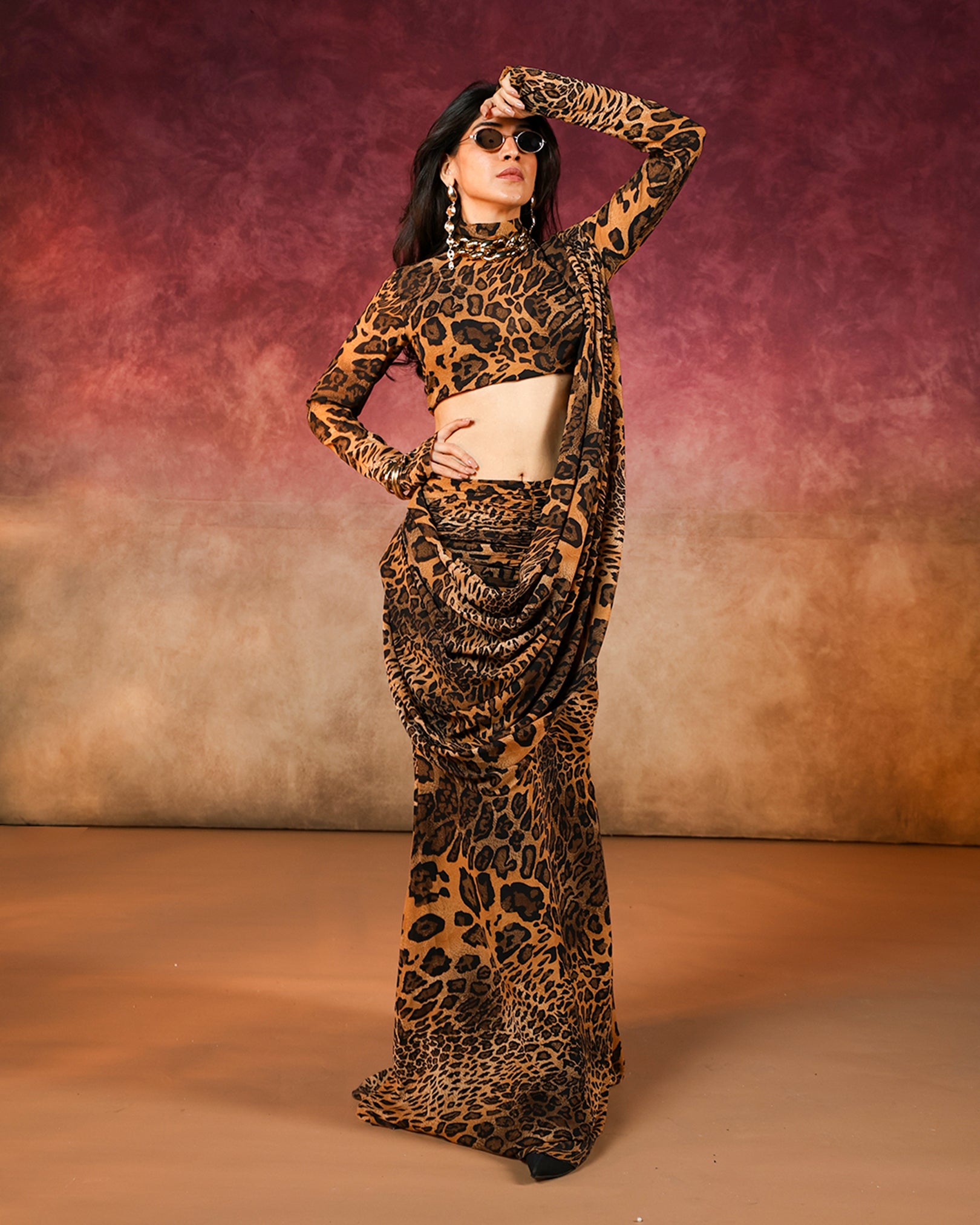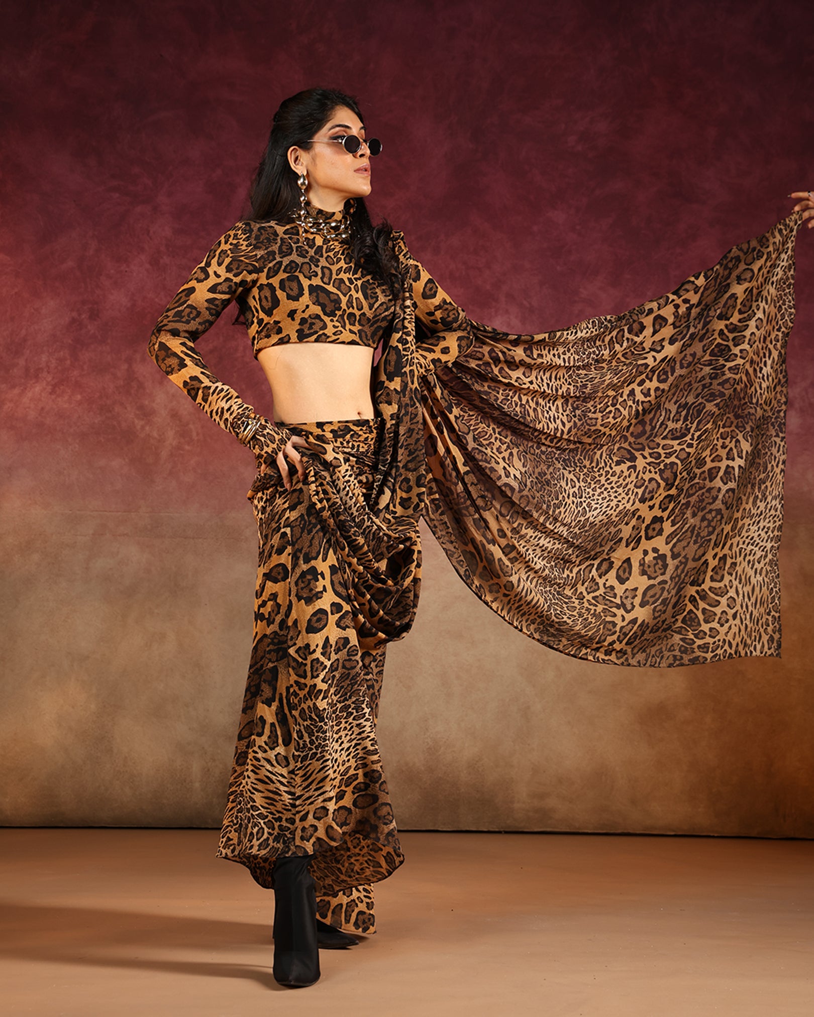 A modern draped ensemble with animal print, evoking the elegance of a saree in a jungle fantasy palette.