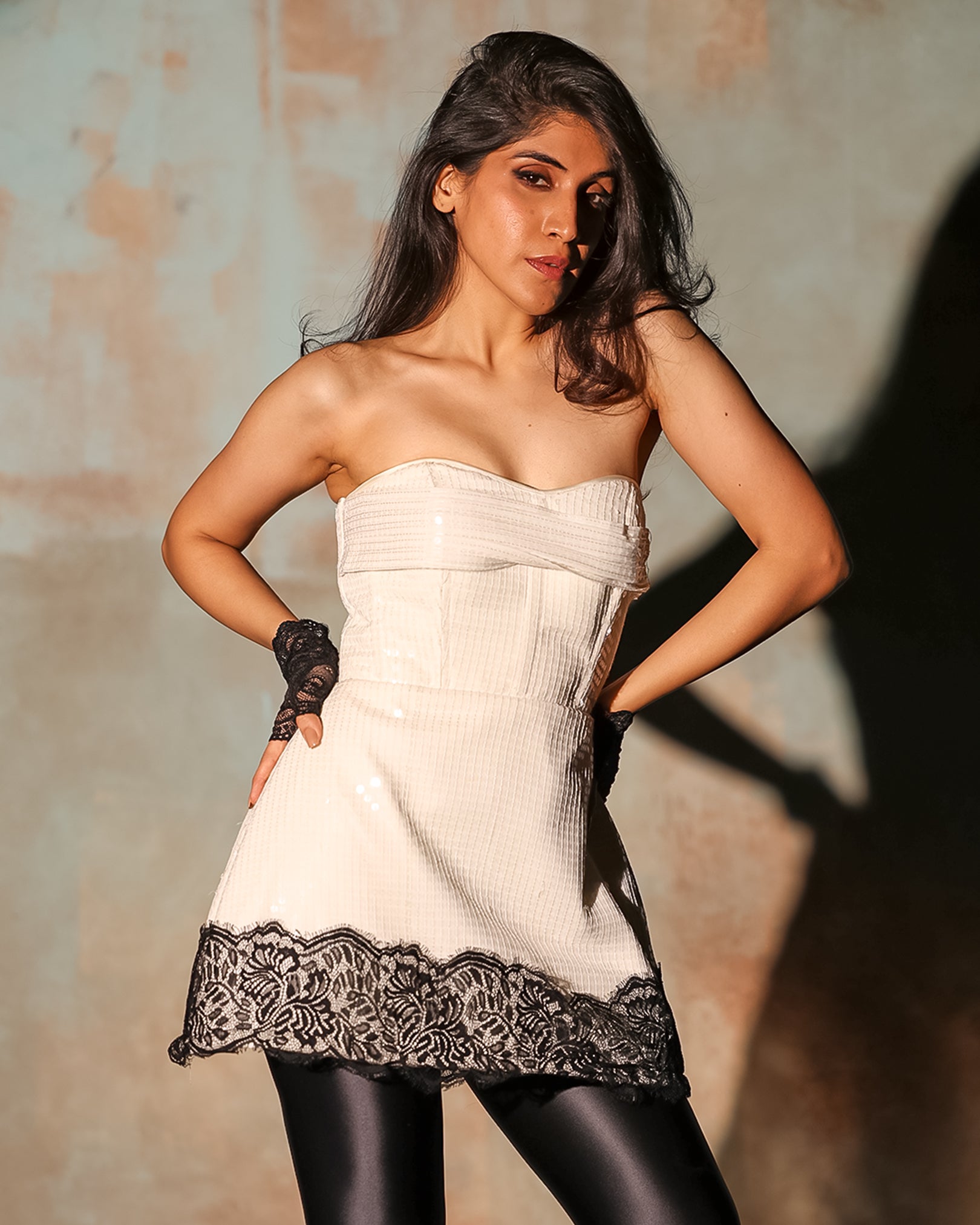 Bathed in moonlit allure, the Lune Blanche dress reimagines classic corsetry through a modern, romantic lens. Its ivory surface shimmers with transparent sequins, subtly catching the light with every movement. The silhouette is sculpted through delicate boning from waist to hem, tracing the contours of the body with precision. Black Chantilly lace frames the hemline — a whisper of contrast that deepens the look’s mystique. Finished with a lace-up back, Lune Blanche is both structured and ethereal — a portrait of luminous restraint.