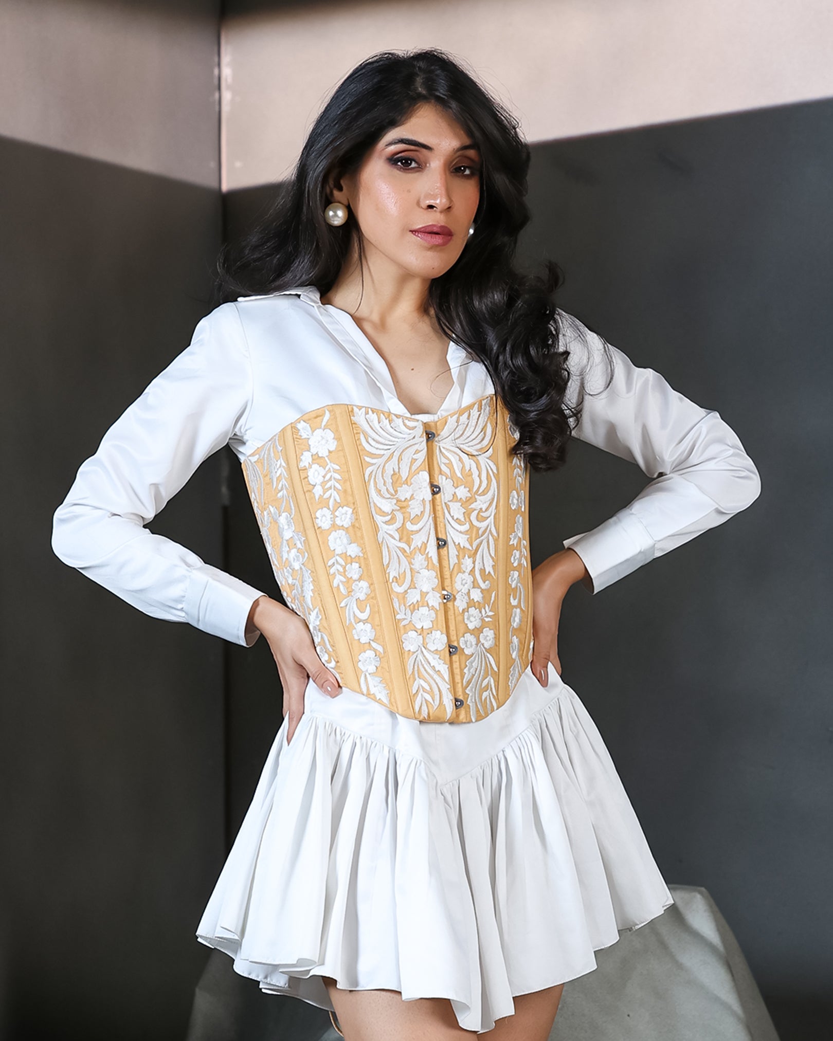 The Lyra Ensemble is a celebration of modern femininity with a structured twist. Featuring a crisp white shirt and corset paired with a finely pleated skater skirt, this look embodies refined ease. The highlight—a handcrafted yellow corset adorned with delicate threadwork embroidery and metallic fastening—adds an edge of artistry and elegance, making the set both versatile and statement-worthy.