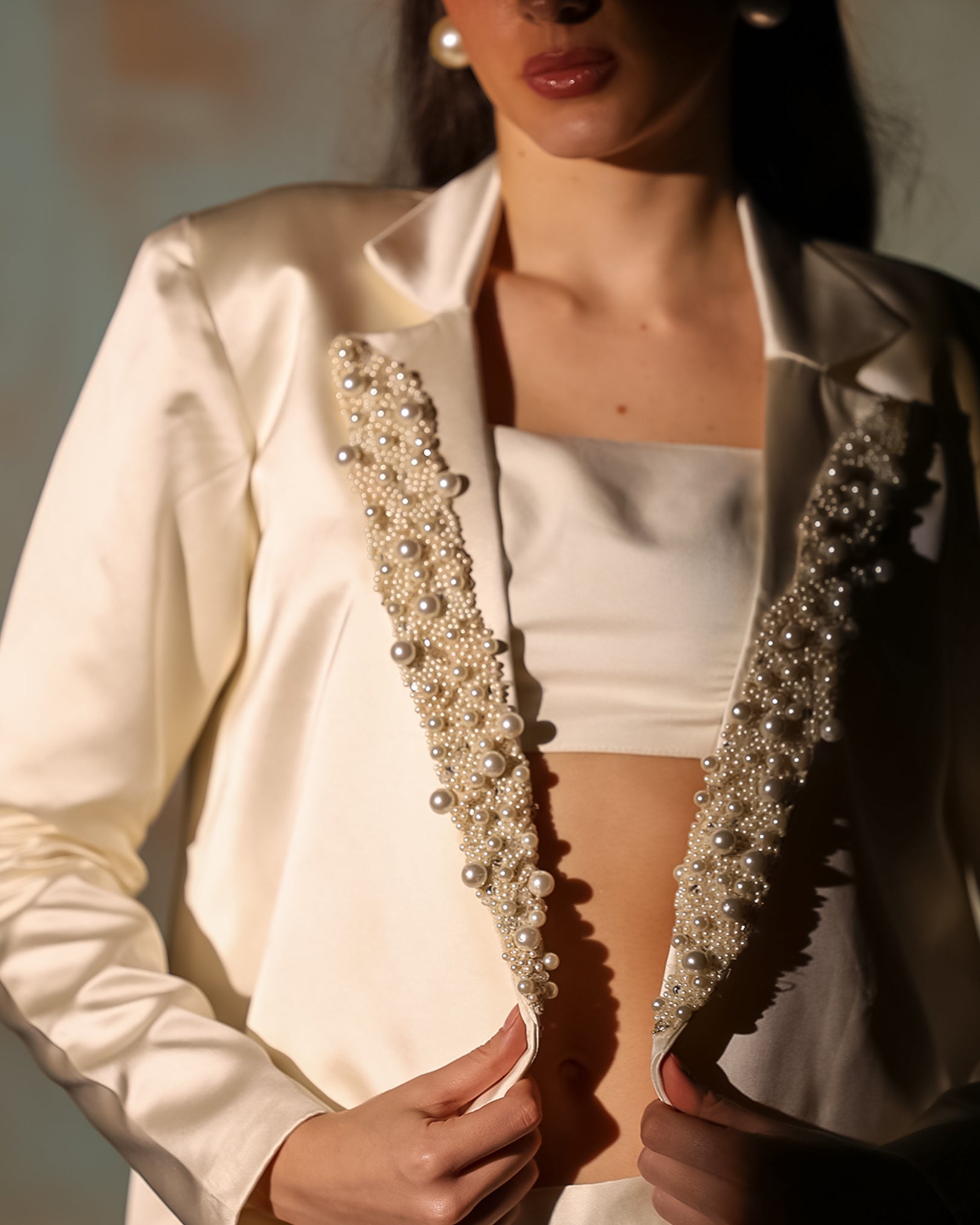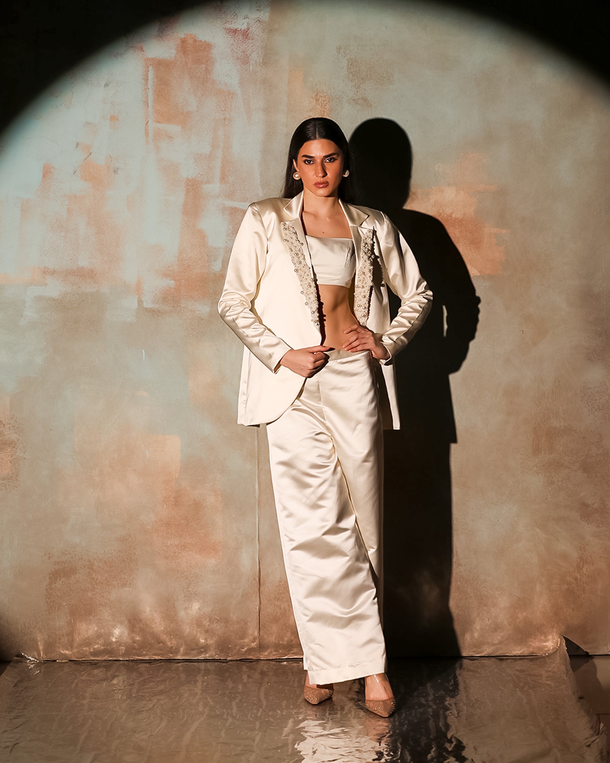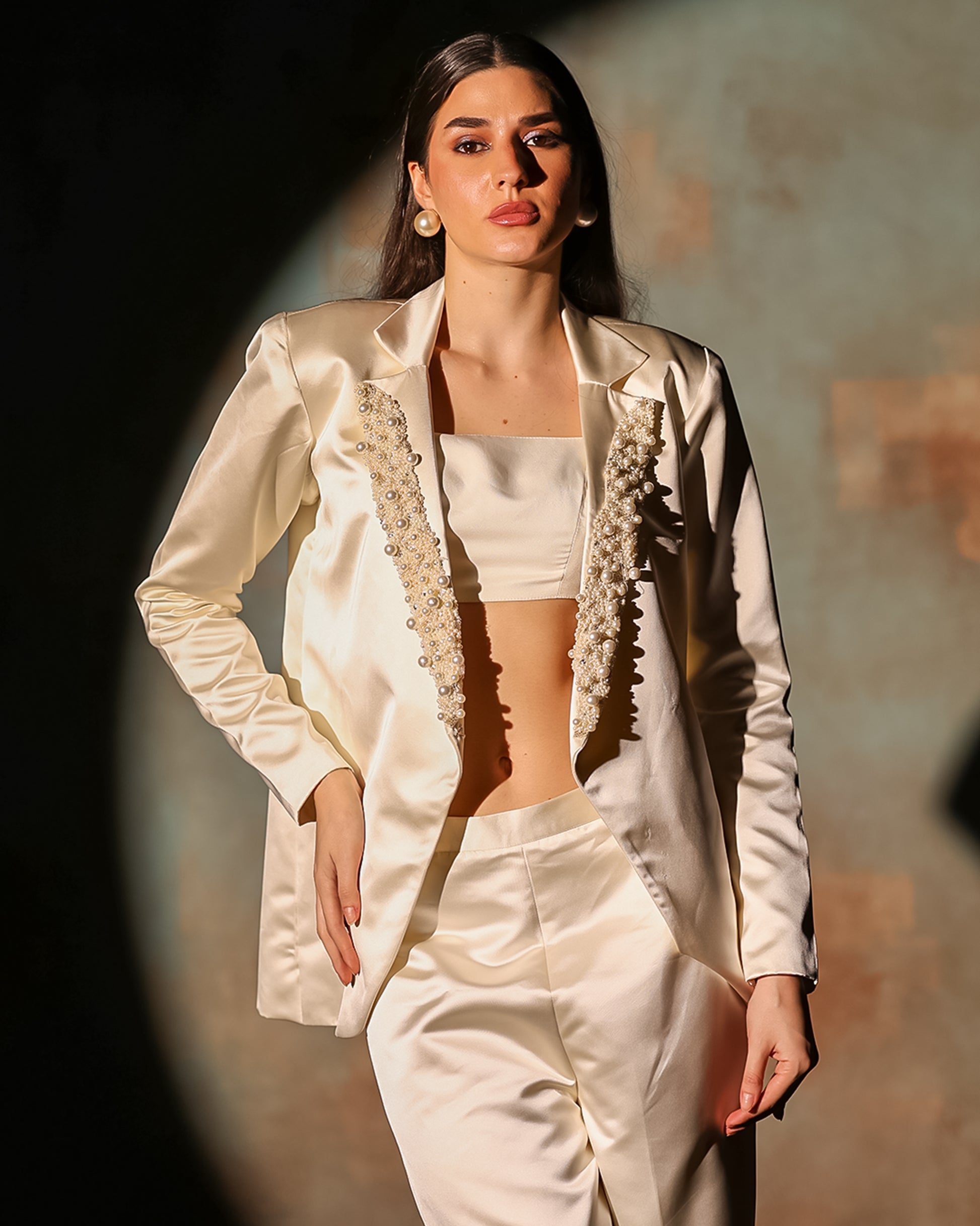 A study in luminous minimalism, Opaline captures the essence of soft power and quiet opulence. The structured satin blazer is adorned with hand-embroidered pearl detailing along the collar — a modern echo of classic refinement. Paired with tailored trousers and a minimalist bralet, the look exudes a sculptural balance between delicacy and authority. Opaline moves like light across silk — serene, commanding, and timelessly feminine.