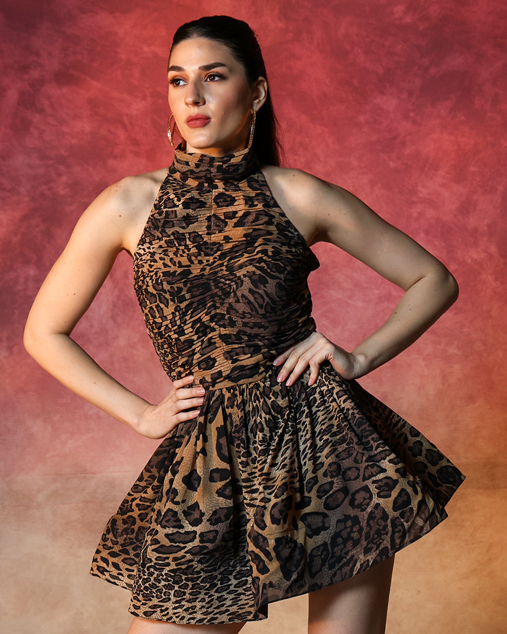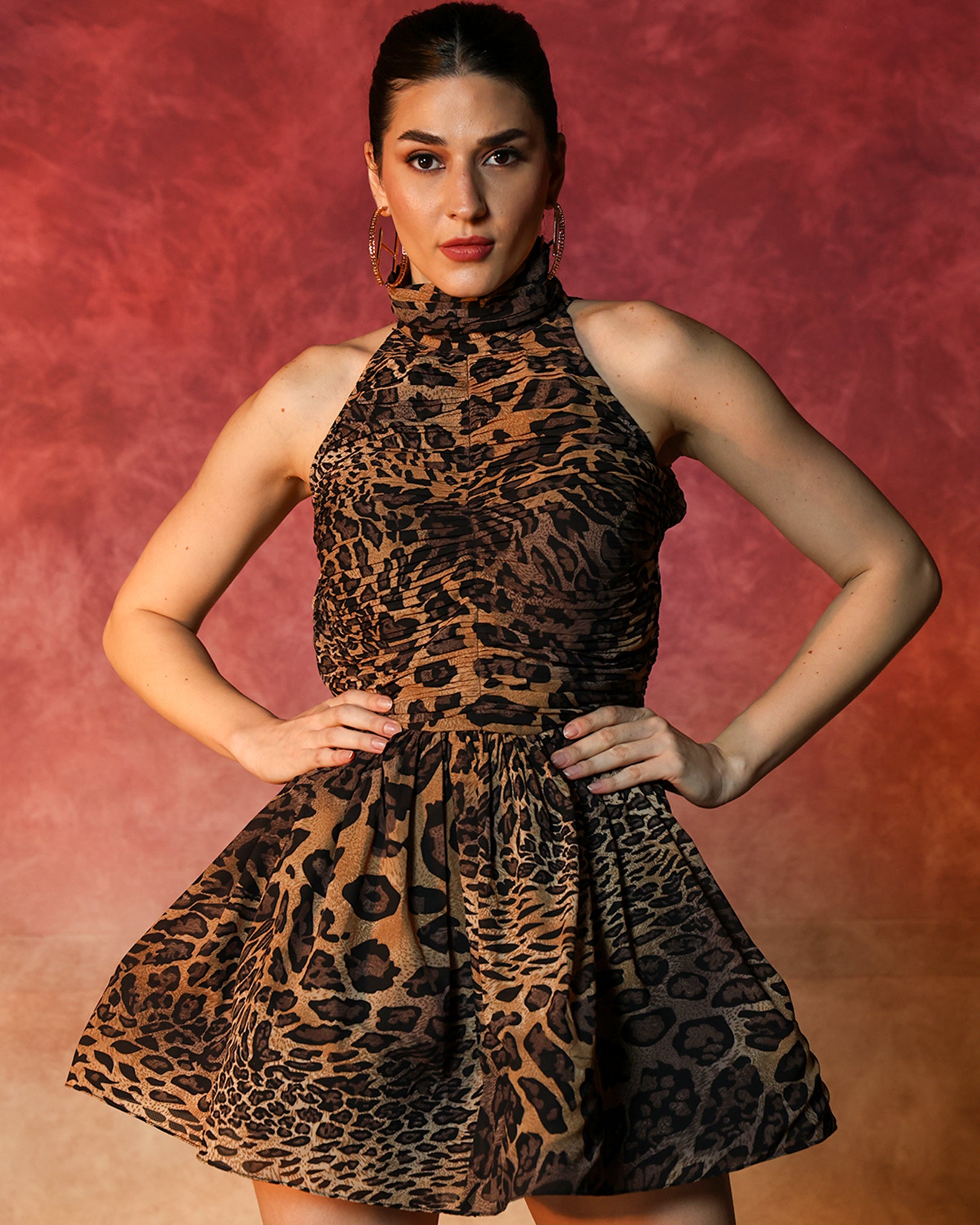An animal print flared mini dress with flirty ruffles and unapologetic flair.