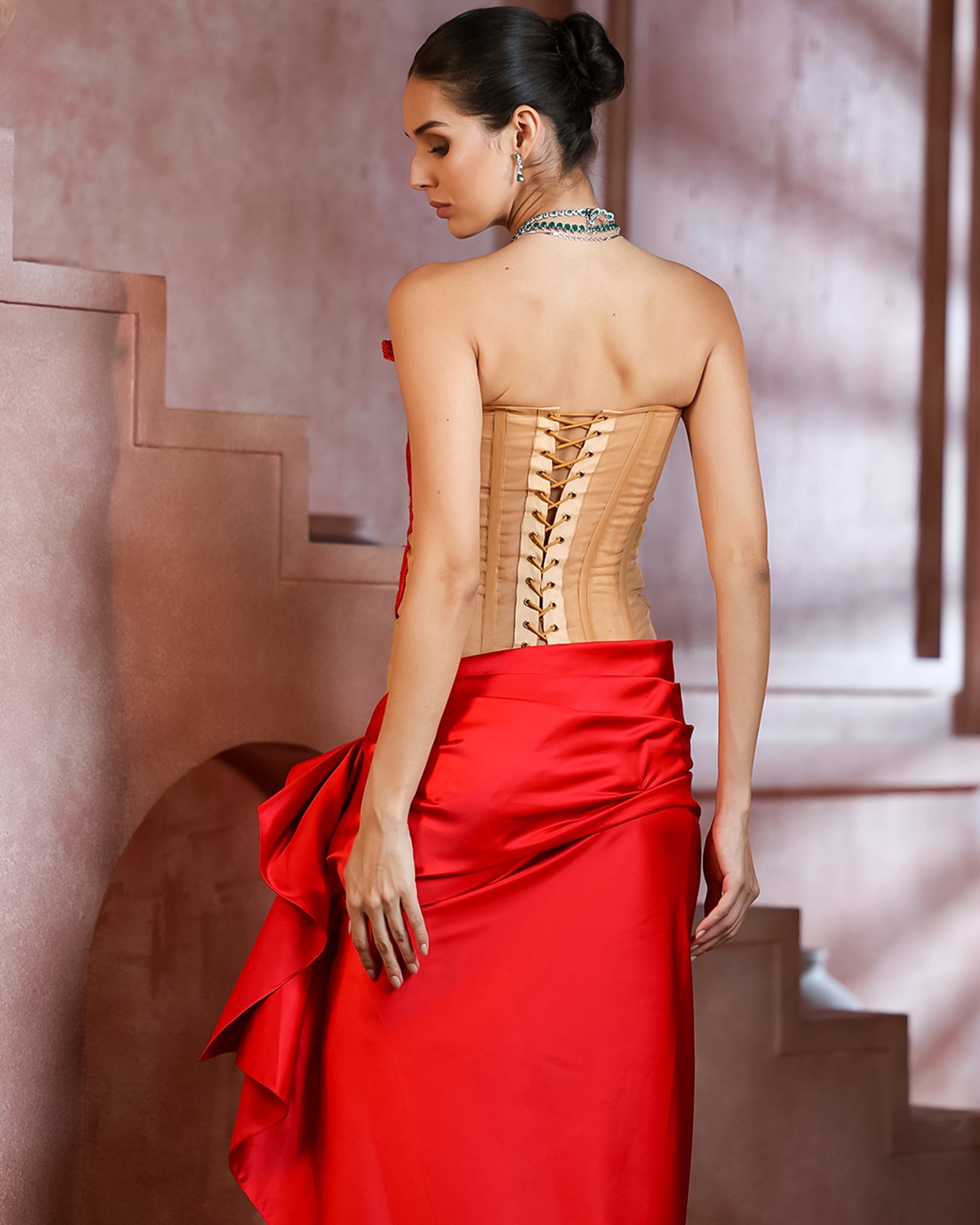The Sorrelle Ensemble radiates bold allure with a nude organza corset intricately detailed in braided silk lace, paired with a fluid crimson draped skirt. A harmony of texture and tone, it captures timeless femininity and the power of red in motion.